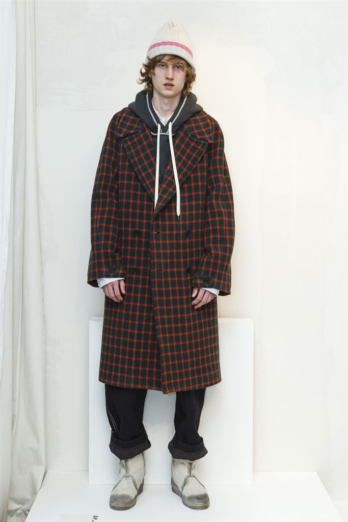例如,花式條紋拼色毛衫、紅藍黃法蘭絨格紋襯衫,搭配跳色壓線的黑色內刷毛牛仔褲,還有聚酯材質的連帽anorak外套、老一輩的古著西裝與直筒西裝褲。或是在袖子上玩弄印花與材質拼貼,創造層次錯覺。