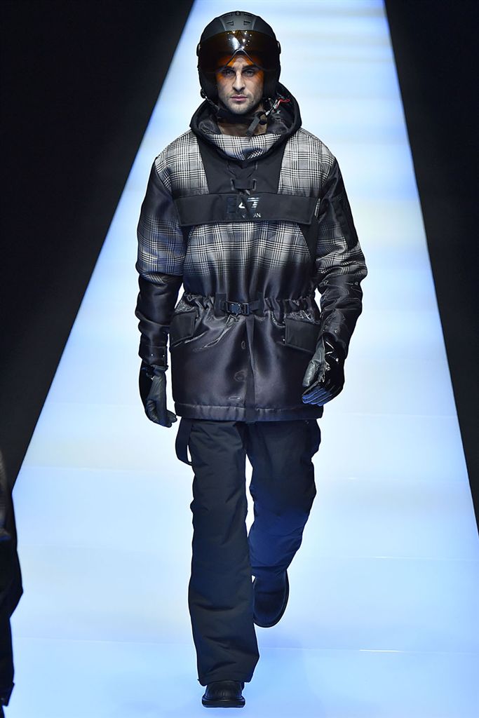Diesel Black Gold結合誇大的箱型輪廓及放大的口袋設計及絨毛領片,搭配皮褲顯得帥氣。Emporio Armani的飛行運動風運用誇大領片及扣環收腰細節,為滑雪裝束增添一股科技時尚感。而Ermanno Scervino則打守舊派,經典雙排扣西裝的輪廓運用機能面料更新了它的適穿性,窄肩設計更顯俐落。