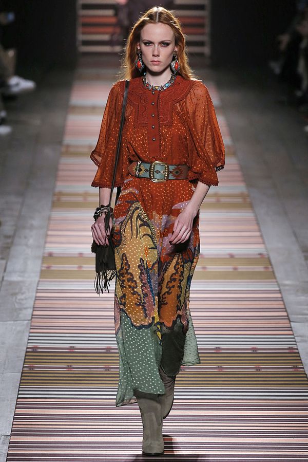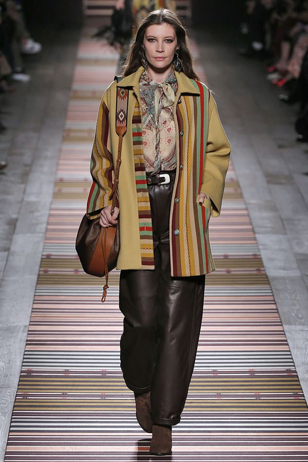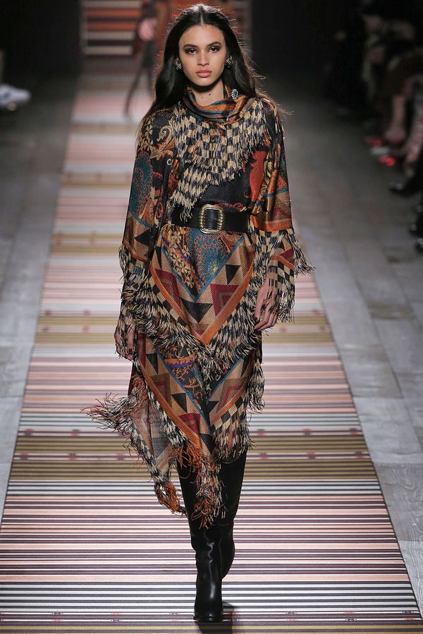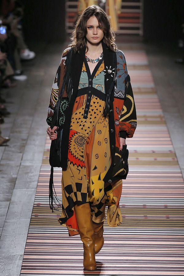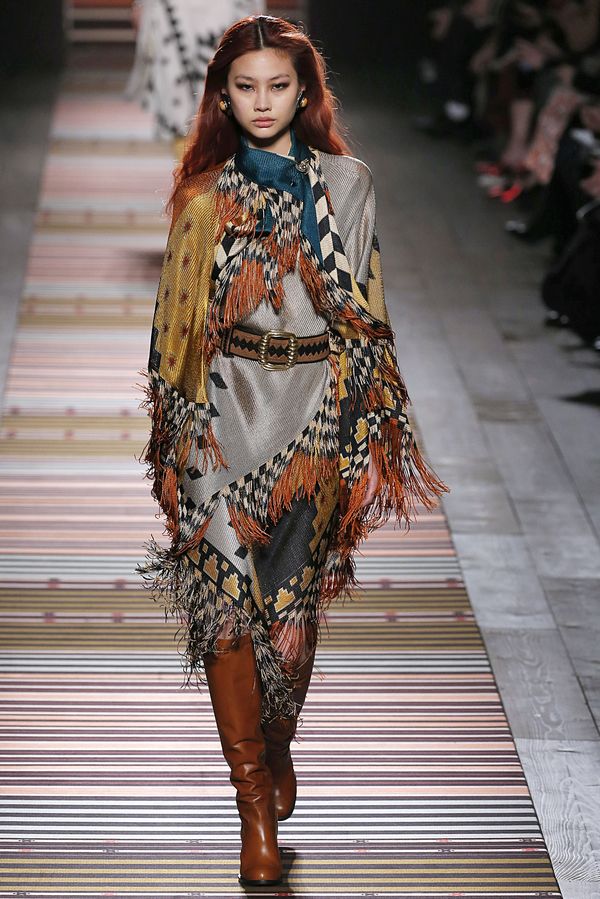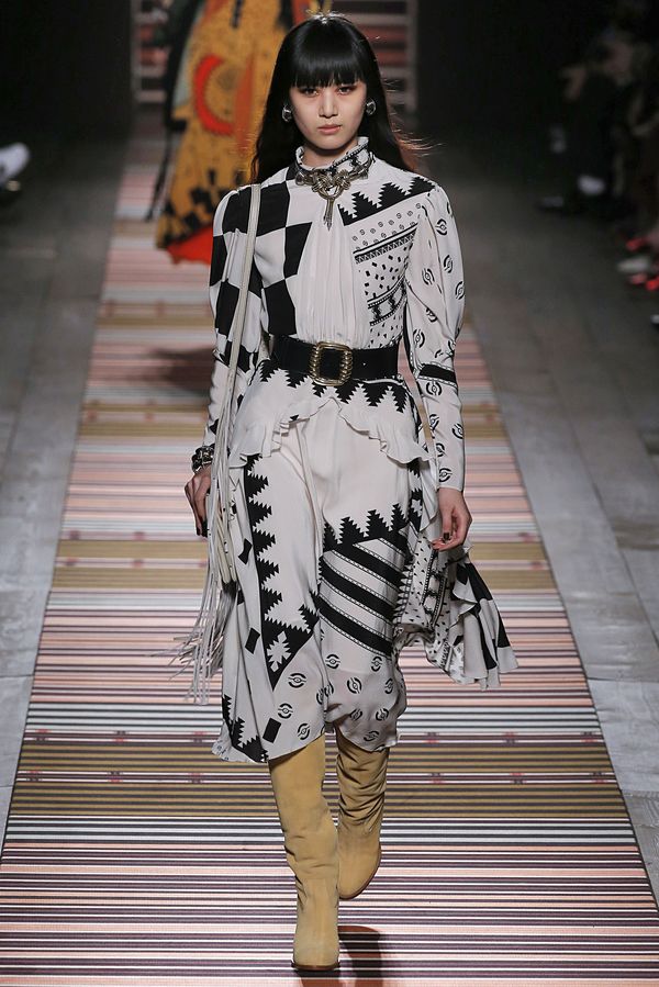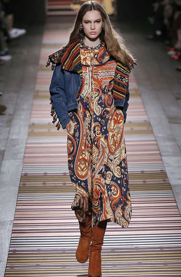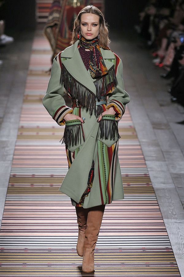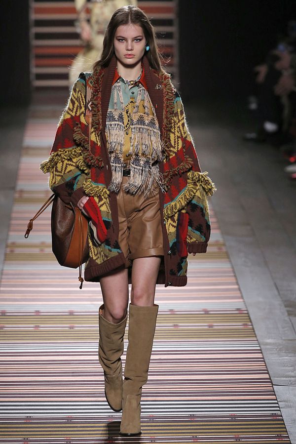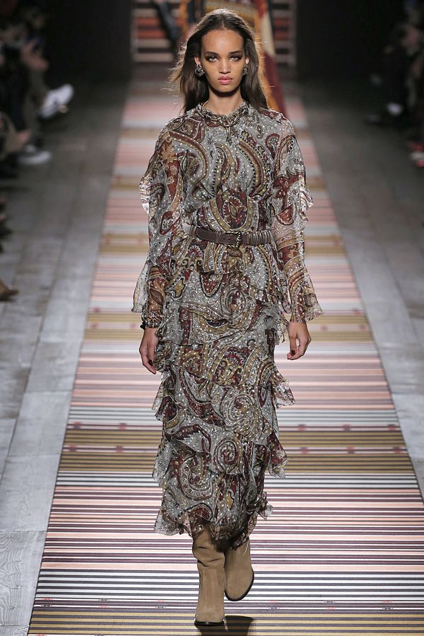 紡織品設計起家的Etro以繁複華麗的paisley 變形蟲圖紋名揚國際,2018秋冬設計總監Veronica Etro帶給大家不同已往的華麗繁複西部風情,融入看似西藏、安地斯山脈或是印第安元素,展現柔美浪漫卻個性十足的西部風情! 看似華麗浪漫的paisley變形蟲圖紋背後其實需要準確的精算,Veronica Etro將浪漫精神與理性計算完美融合在服裝上,並將華麗的流蘇、多變的變形蟲、獨特的民族風圖騰與保暖的絨布元素融入冬季大衣、披風、皮褲與雪紡洋裝,再以華美的腰帶、高筒靴與流蘇皮包妝點。