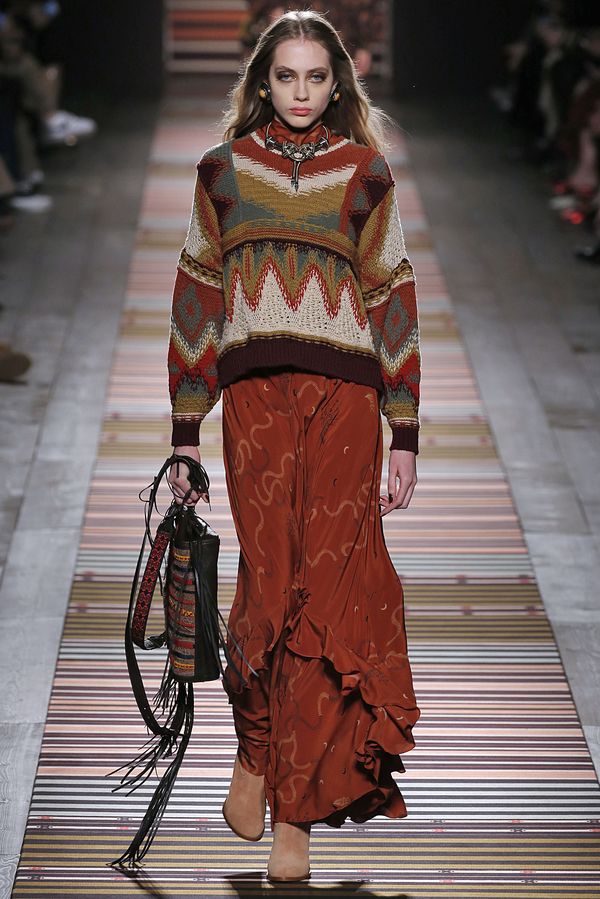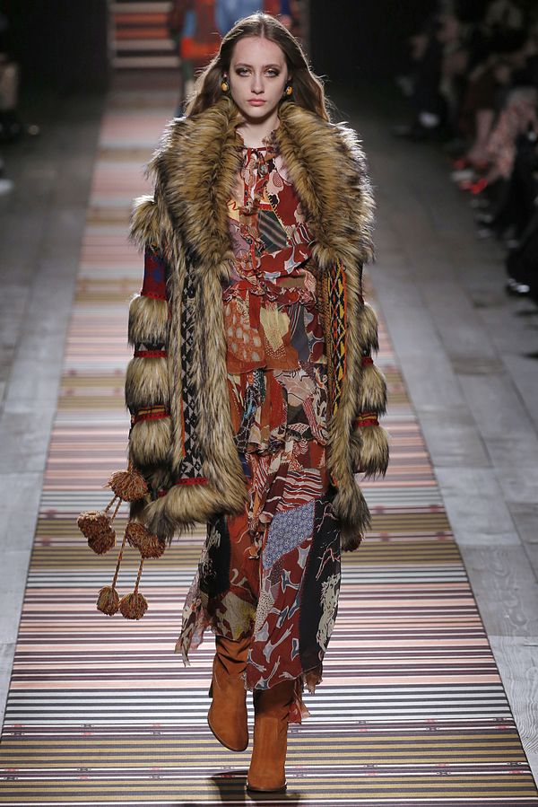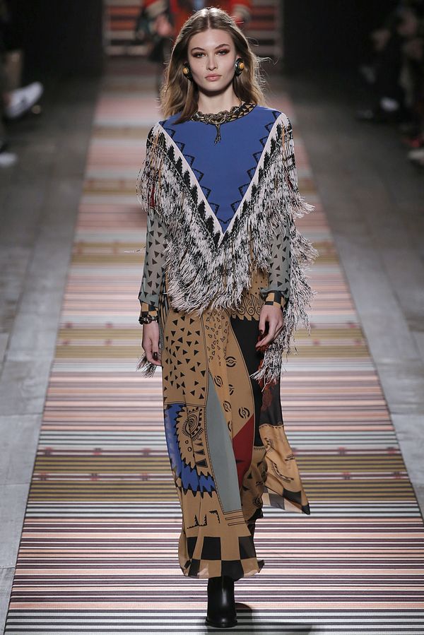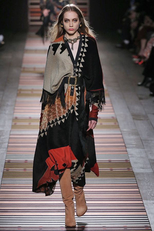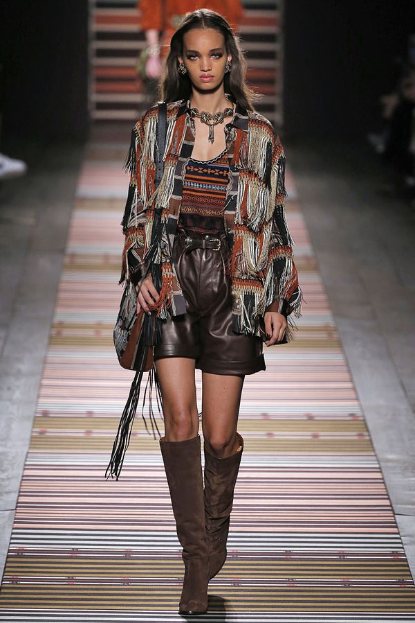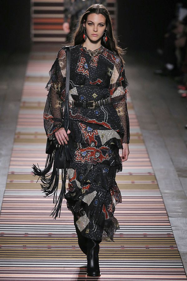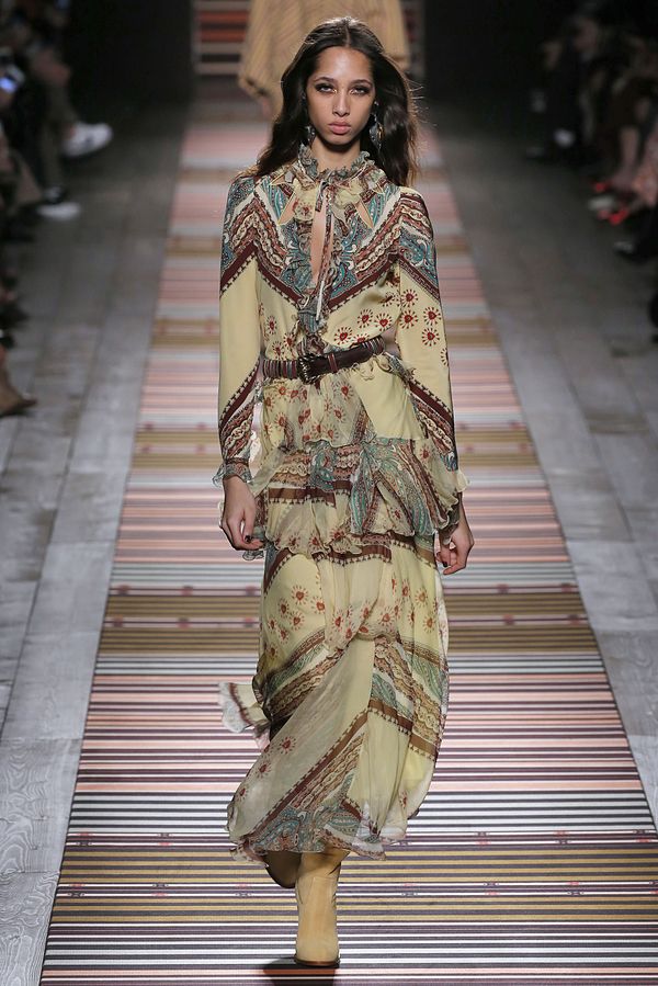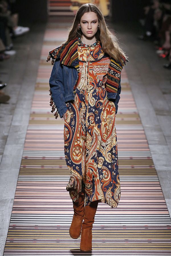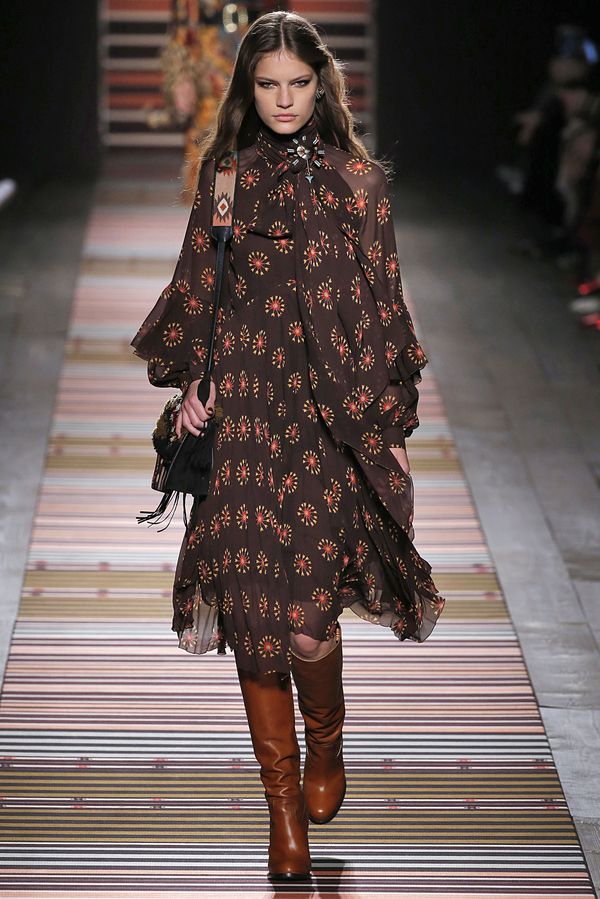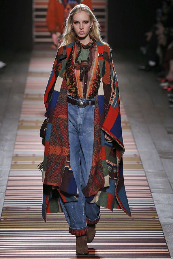 紡織品設計起家的Etro以繁複華麗的paisley 變形蟲圖紋名揚國際,2018秋冬設計總監Veronica Etro帶給大家不同已往的華麗繁複西部風情,融入看似西藏、安地斯山脈或是印第安元素,展現柔美浪漫卻個性十足的西部風情! 看似華麗浪漫的paisley變形蟲圖紋背後其實需要準確的精算,Veronica Etro將浪漫精神與理性計算完美融合在服裝上,並將華麗的流蘇、多變的變形蟲、獨特的民族風圖騰與保暖的絨布元素融入冬季大衣、披風、皮褲與雪紡洋裝,再以華美的腰帶、高筒靴與流蘇皮包妝點。