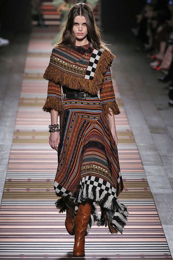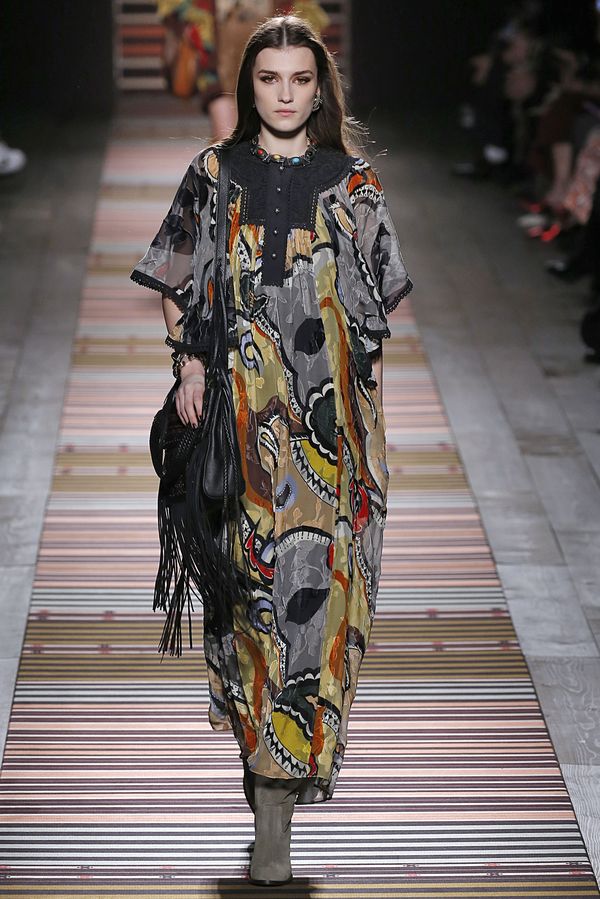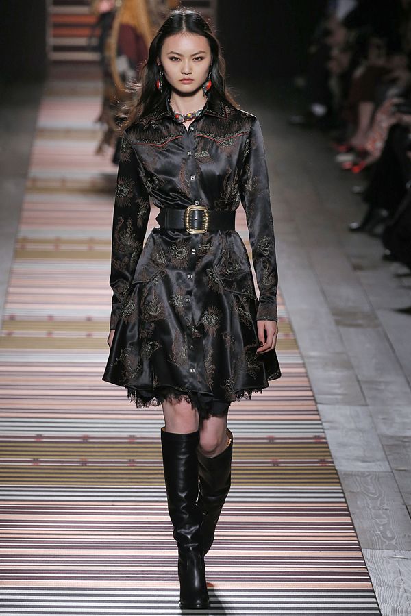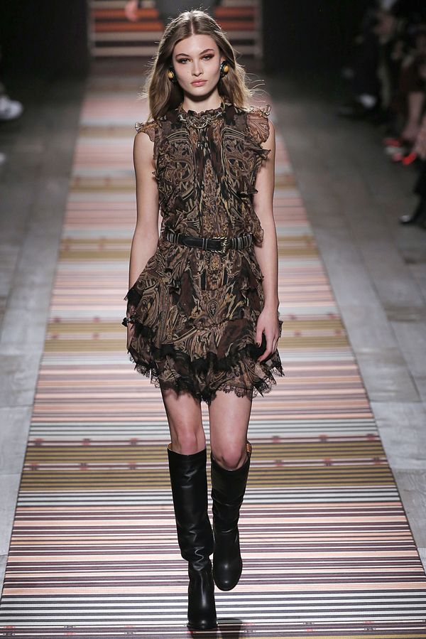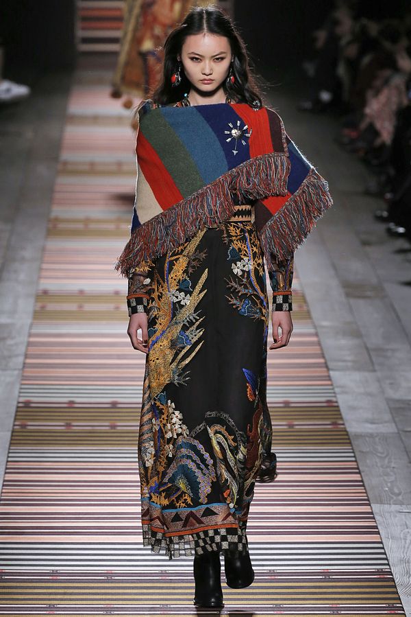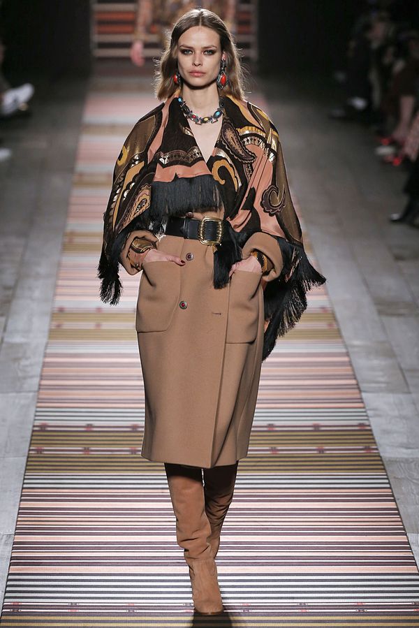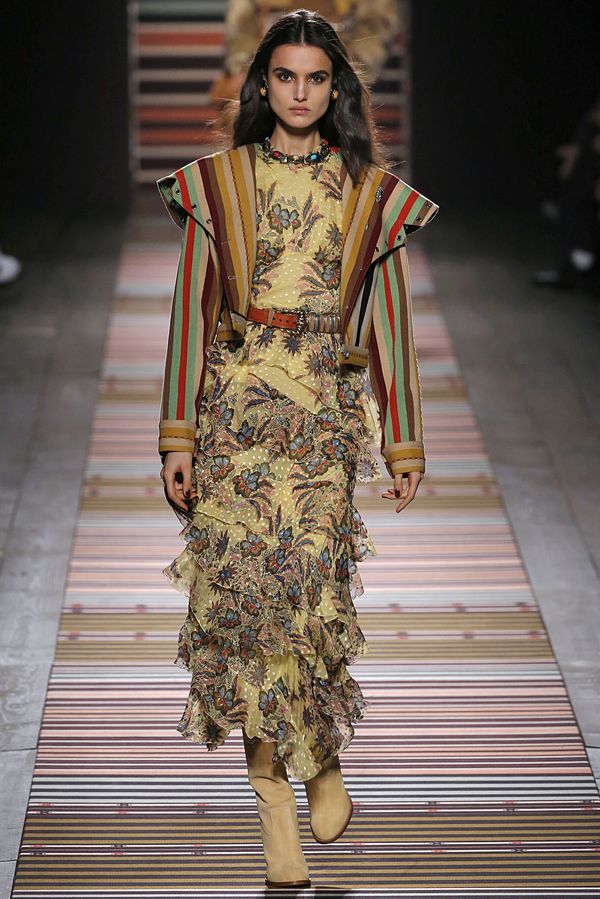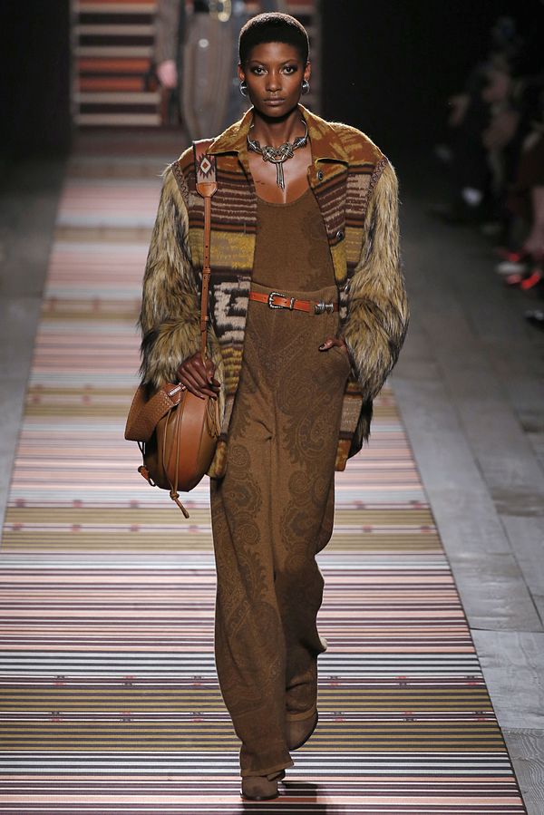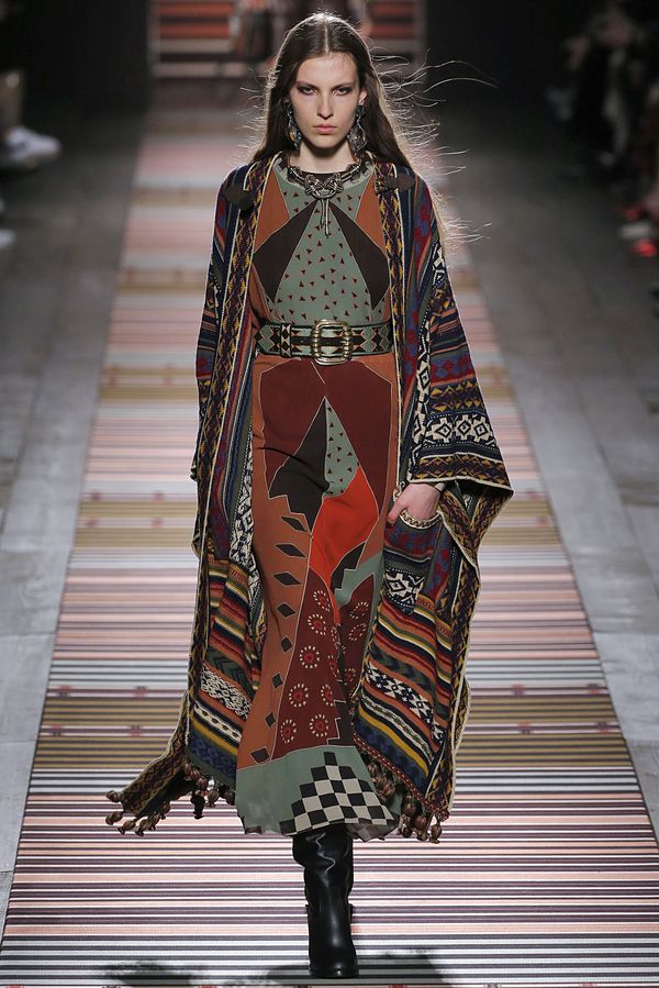 紡織品設計起家的Etro以繁複華麗的paisley 變形蟲圖紋名揚國際,2018秋冬設計總監Veronica Etro帶給大家不同已往的華麗繁複西部風情,融入看似西藏、安地斯山脈或是印第安元素,展現柔美浪漫卻個性十足的西部風情! 看似華麗浪漫的paisley變形蟲圖紋背後其實需要準確的精算,Veronica Etro將浪漫精神與理性計算完美融合在服裝上,並將華麗的流蘇、多變的變形蟲、獨特的民族風圖騰與保暖的絨布元素融入冬季大衣、披風、皮褲與雪紡洋裝,再以華美的腰帶、高筒靴與流蘇皮包妝點。