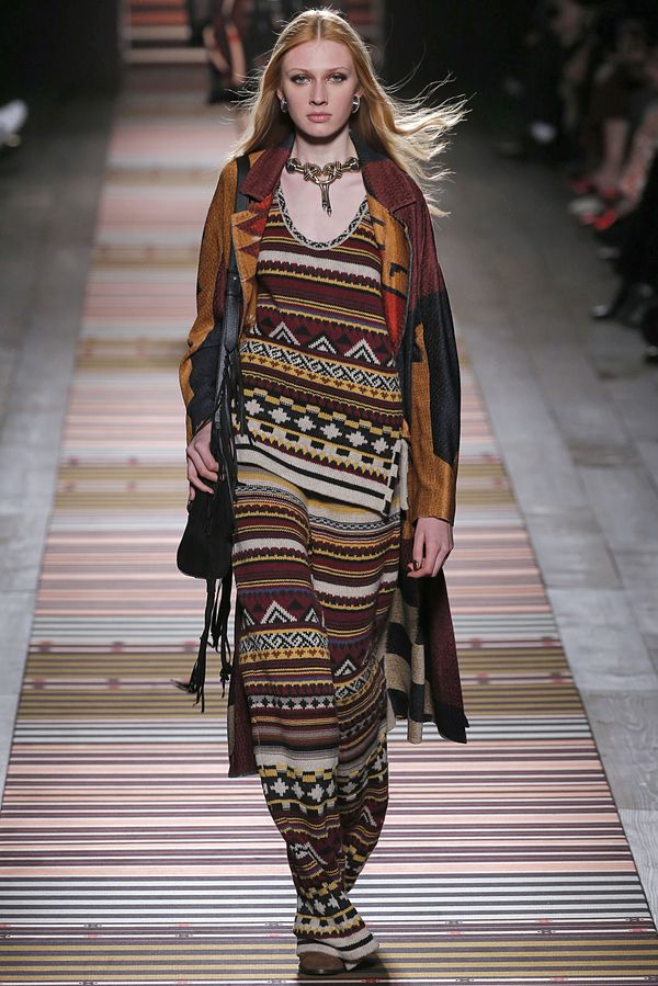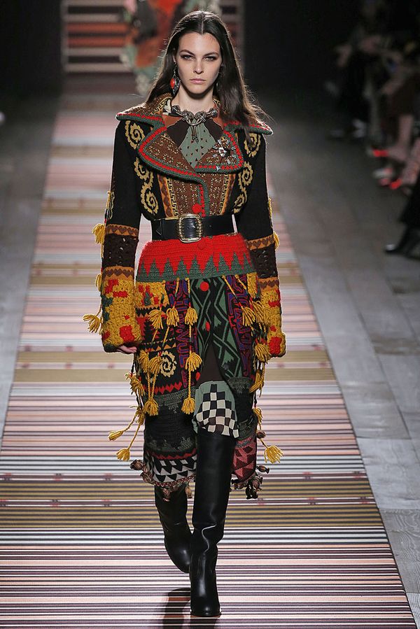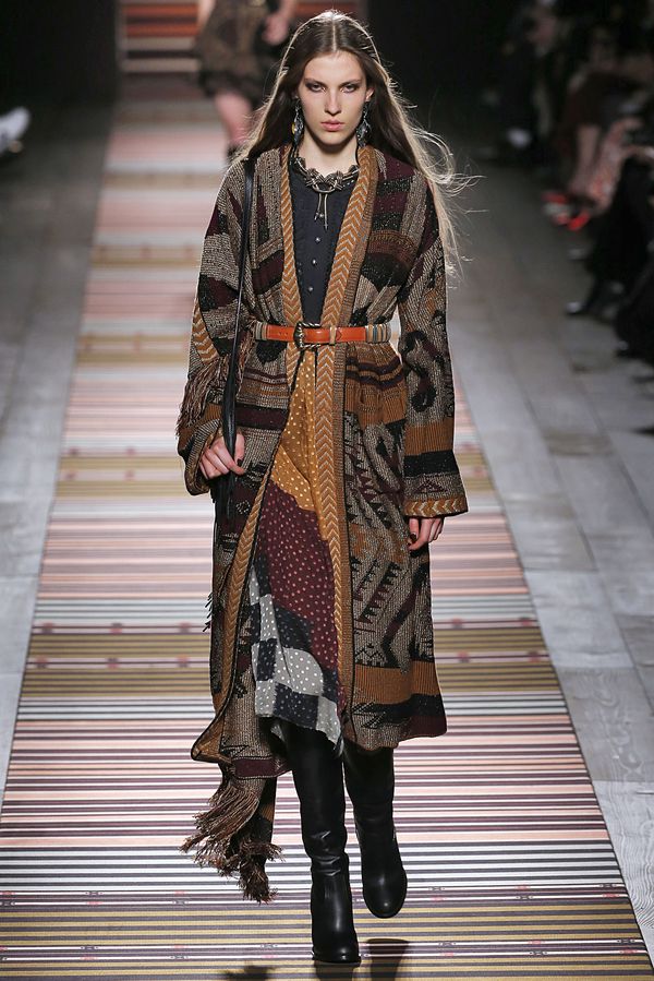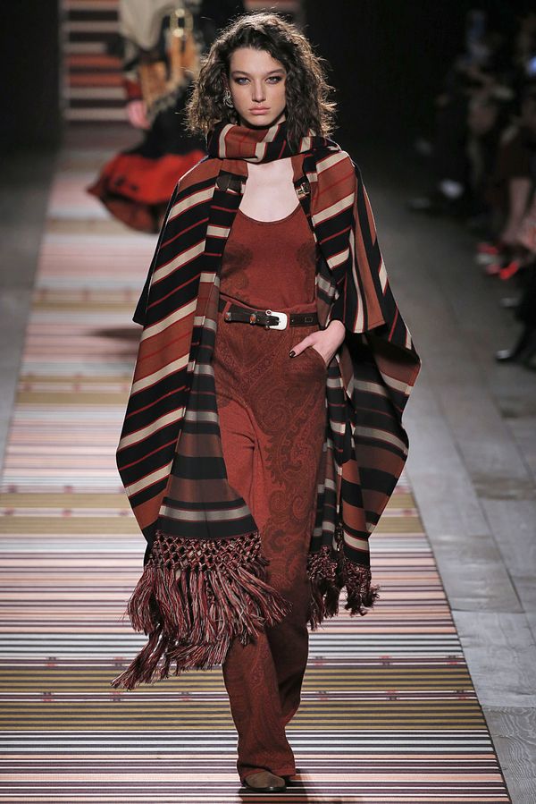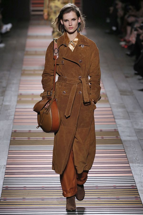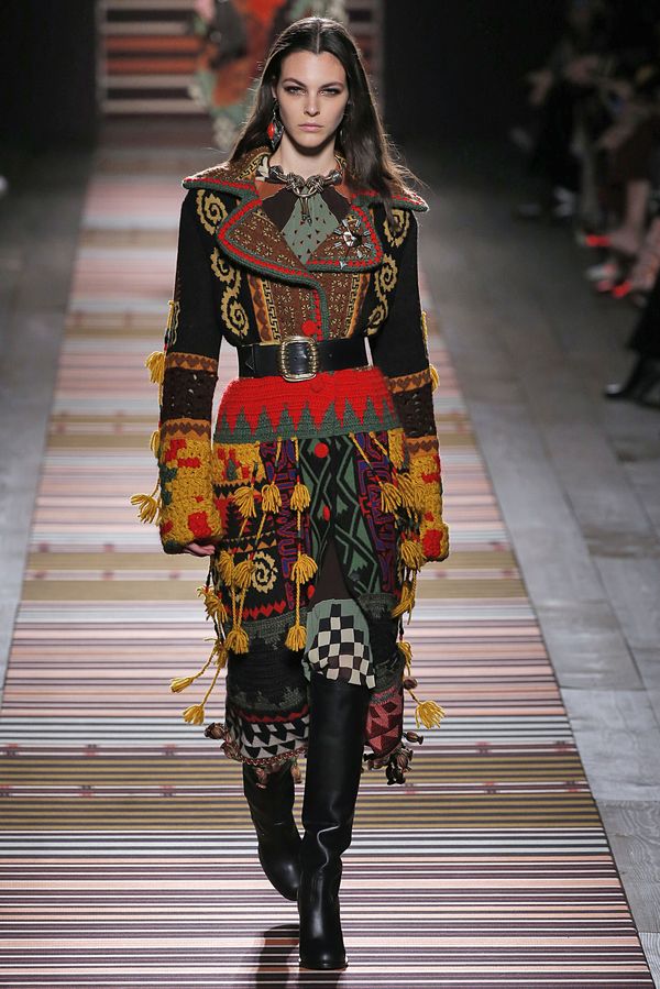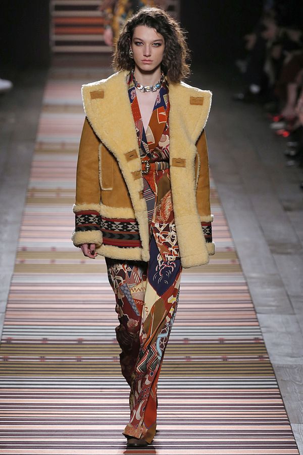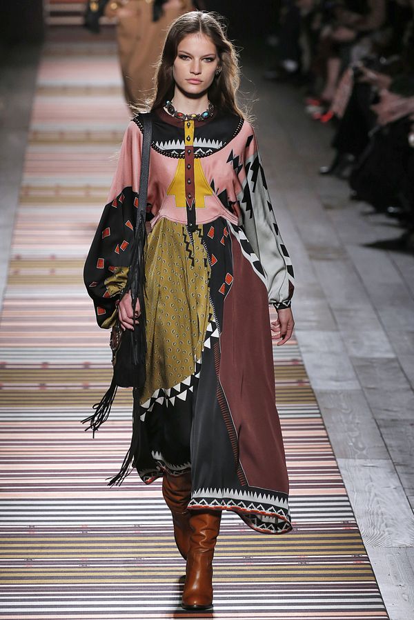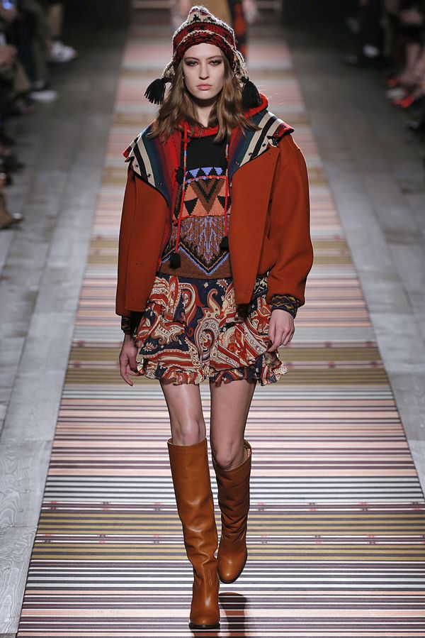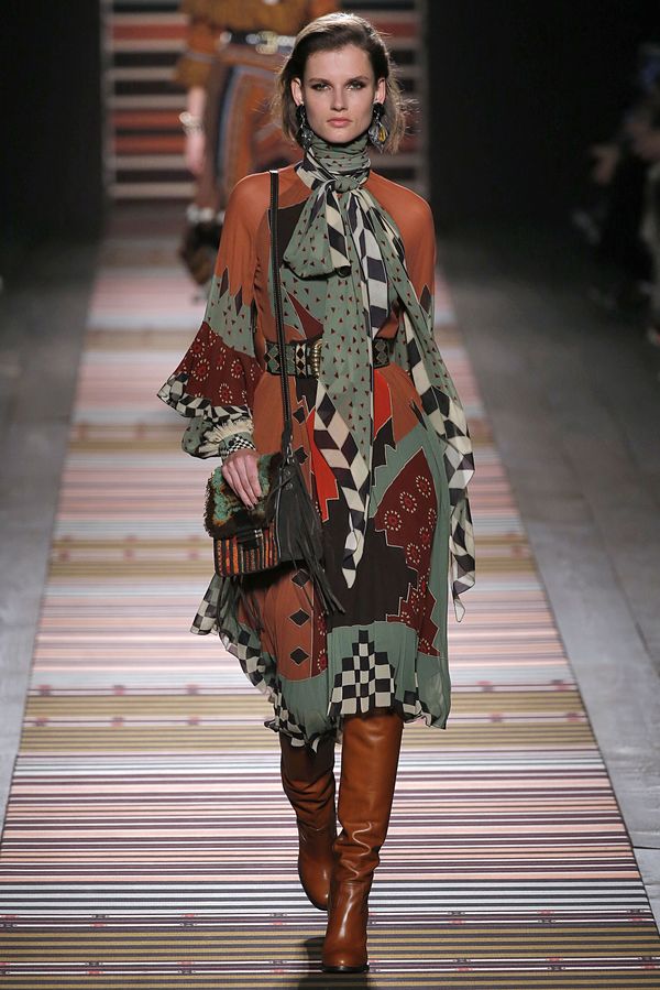 紡織品設計起家的Etro以繁複華麗的paisley 變形蟲圖紋名揚國際,2018秋冬設計總監Veronica Etro帶給大家不同已往的華麗繁複西部風情,融入看似西藏、安地斯山脈或是印第安元素,展現柔美浪漫卻個性十足的西部風情! 看似華麗浪漫的paisley變形蟲圖紋背後其實需要準確的精算,Veronica Etro將浪漫精神與理性計算完美融合在服裝上,並將華麗的流蘇、多變的變形蟲、獨特的民族風圖騰與保暖的絨布元素融入冬季大衣、披風、皮褲與雪紡洋裝,再以華美的腰帶、高筒靴與流蘇皮包妝點。