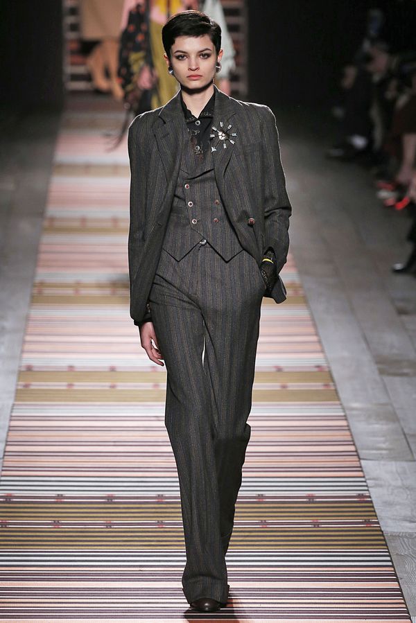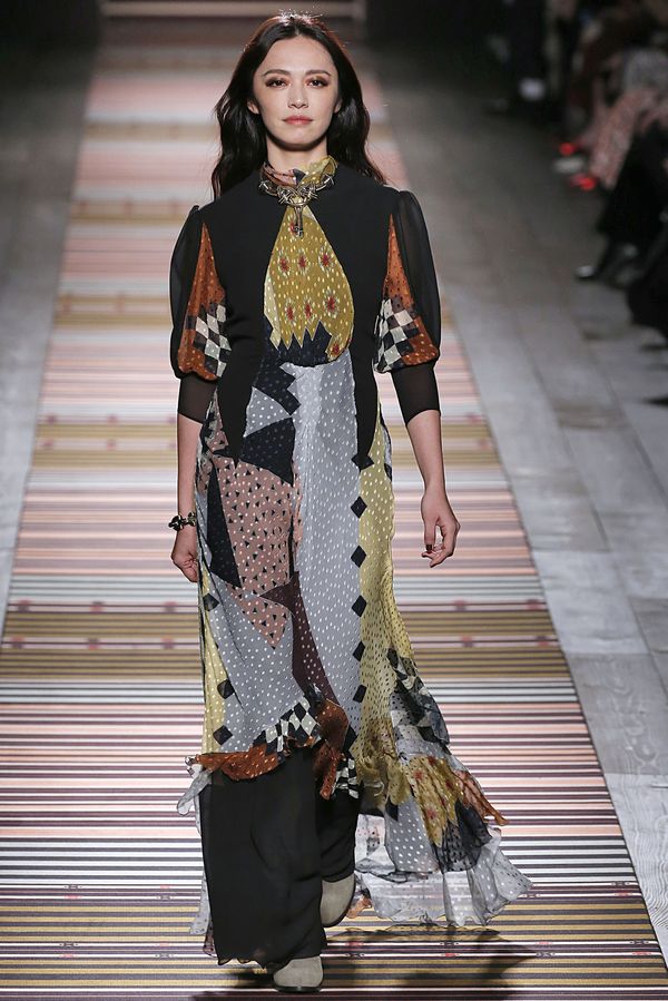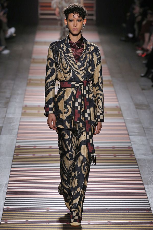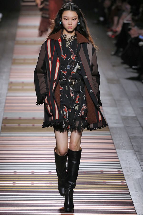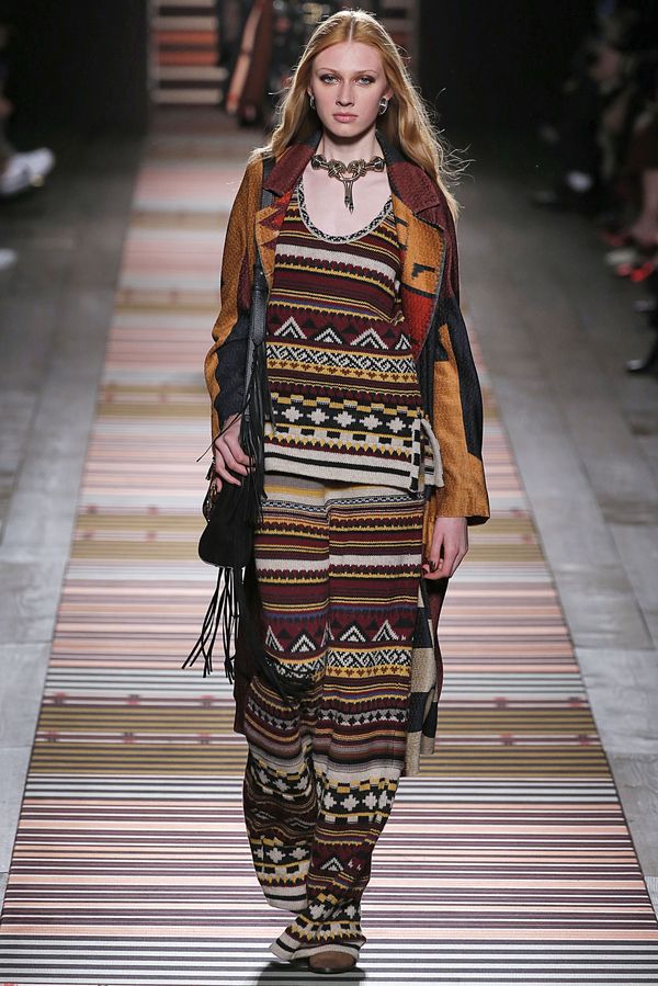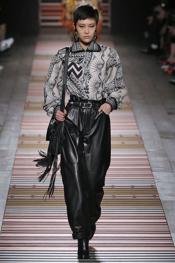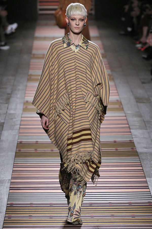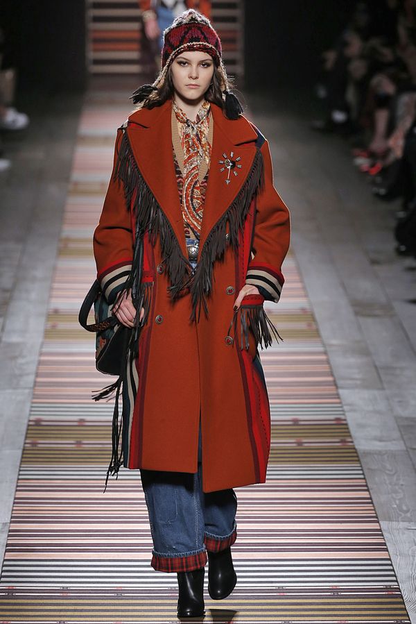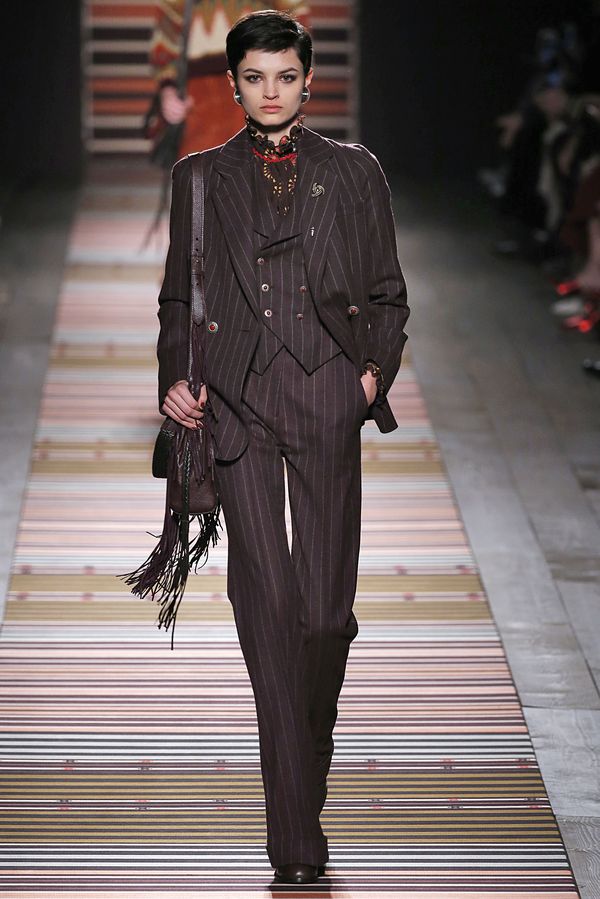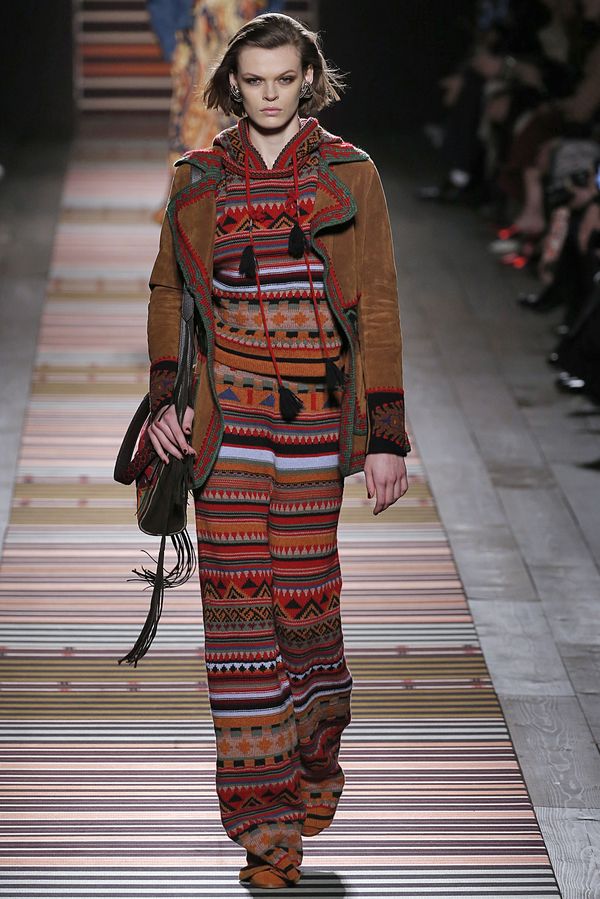 紡織品設計起家的Etro以繁複華麗的paisley 變形蟲圖紋名揚國際,2018秋冬設計總監Veronica Etro帶給大家不同已往的華麗繁複西部風情,融入看似西藏、安地斯山脈或是印第安元素,展現柔美浪漫卻個性十足的西部風情! 看似華麗浪漫的paisley變形蟲圖紋背後其實需要準確的精算,Veronica Etro將浪漫精神與理性計算完美融合在服裝上,並將華麗的流蘇、多變的變形蟲、獨特的民族風圖騰與保暖的絨布元素融入冬季大衣、披風、皮褲與雪紡洋裝,再以華美的腰帶、高筒靴與流蘇皮包妝點。