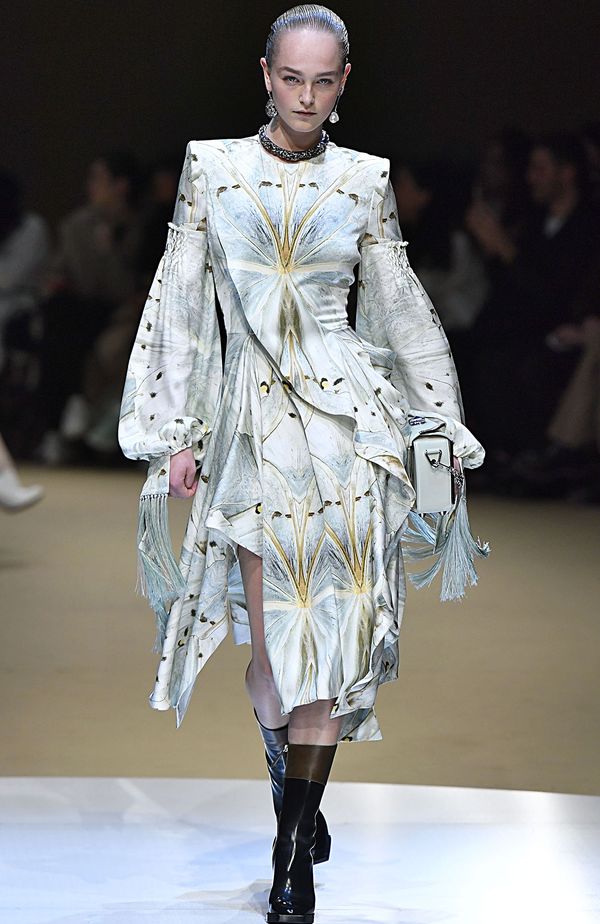 穿著McQueen的女人一直都很強大。2018/19秋冬Sarah Burton沿襲McQueen的精神,講述了女性的各種人格:強壯、脆弱、毅力,並融合McQueen熱衷的自然元素,將繭變成蝴蝶的變態過程,以細膩卻大膽的手法,融合在各種膚色和年齡的模特身上,展現不同的韻味。