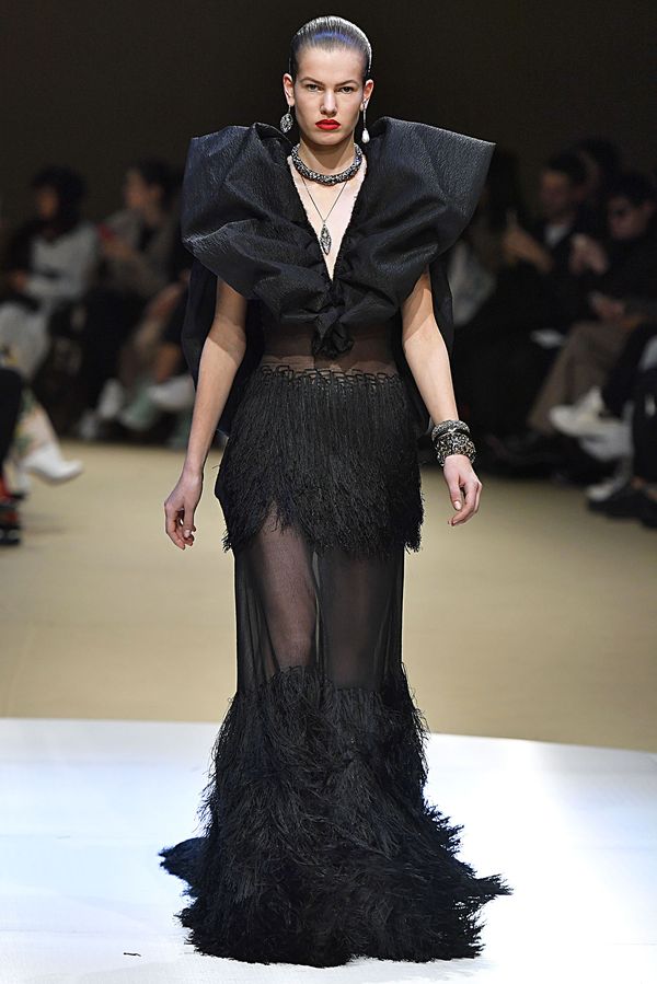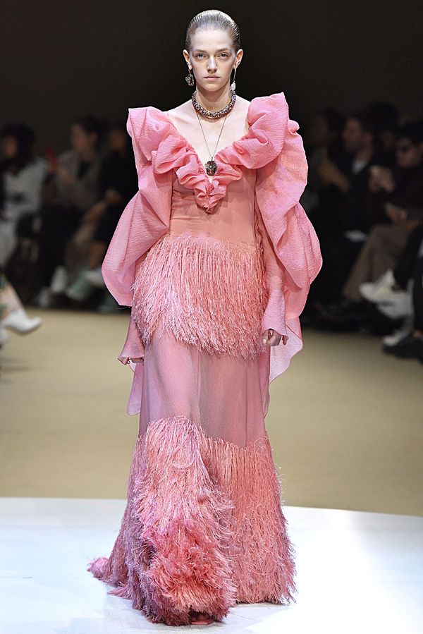 而葫蘆型曲線的燕尾西裝與皮革馬甲彷彿是化蝶前的繭,或解構拼接飄逸的下擺,或於袖口加上流蘇裝飾,或長短搭配營造層次,展示強勢的動感,並保護其下的女性軀體,也是本季的亮點單品之一。