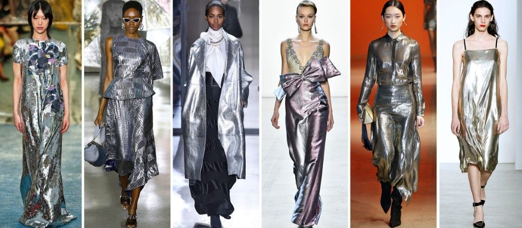 前衛科技的太空銀,在2019秋冬大受歡迎,從晚禮服、都會日裝、時尚大衣,紛紛以異材質亮片、塑滑皮質、流瀉絲質的材質應用,展現不同風情。例如Carolina Herrera晚禮服上以銀色亮片為主要反光條件,有別其他面料的質感,具有玩味氣息,優雅不失前衛;Christian Siriano的兩件式都會裙裝,運用特殊壓褶感帶有波紋感的面料,前衛時尚;Zimmermann的光澤銀亮皮大衣,前衛有個性;Badgley Mischka將亮皮質與蕾絲搭配,一柔一剛展現不同面貌;Cushnie運用素材特性,柔質面料與像水蛇般的色澤水波感,搭配都會型的款式,展現都會女郎的柔美氣質;Helmut Lang的小洋裝亦採水波感面料與色澤,柔美中帶點前衛。