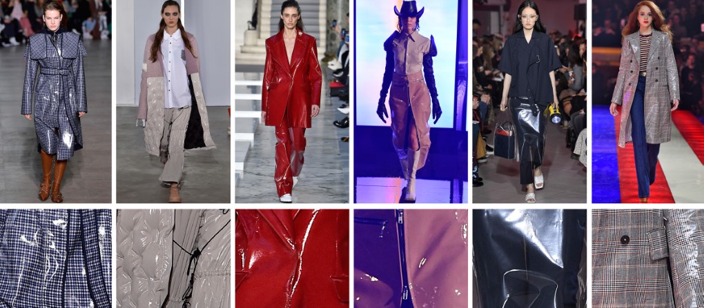上一季常見的塑膠感材質延續到2019秋冬,可見大篇幅與局部運用於服裝。如Cedric Charlier及Tommy Hilfiger的長版格紋外套在塑料質感下顯得輕盈許多,也少了嚴肅感。Jarel Zhang局部的衍縫鋪棉加工為塑面的PV材質增加了體積感。Kristina Fidelskaya犀利的塑面漆皮寬肩外套,全身的鮮紅色氣勢十足。Nimamounah的前衛造型配上亮面漆皮裙,詭譎神秘。Rokh外罩在長褲外的透明裙,多層次穿搭手法也讓一身黑的酷勁裝扮多了一抹科技風。