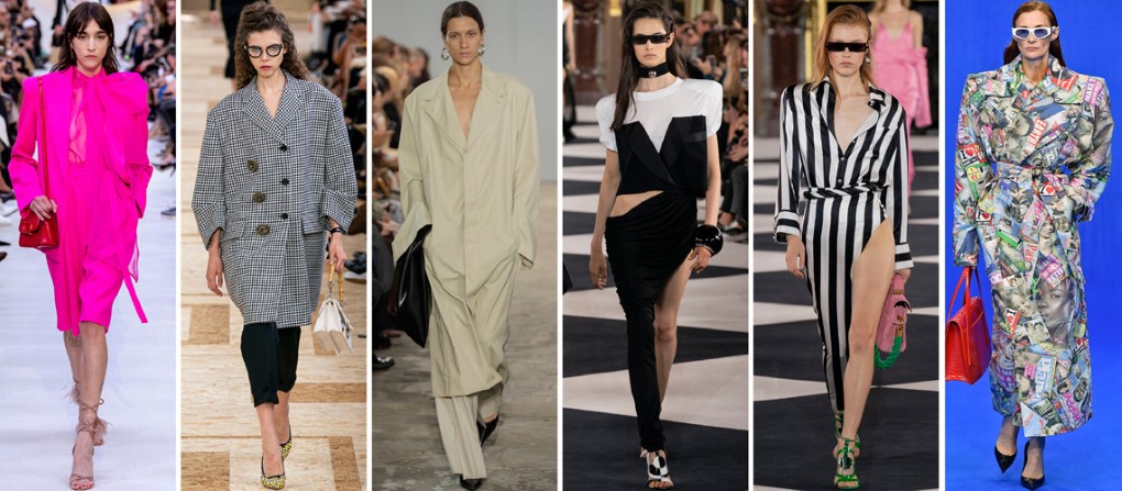 Balenciaga 20春夏整個系列都是超寬肩的款式設定,大衣、套裝、西裝外套等重複的視覺呈現讓你無法忽視這個流行風潮,嚴謹中卻也保留品牌一貫的搞怪風格,將充滿人臉的雜誌封面做成滿版印花,追求名利的最高極致不就是將名氣穿上身嗎?