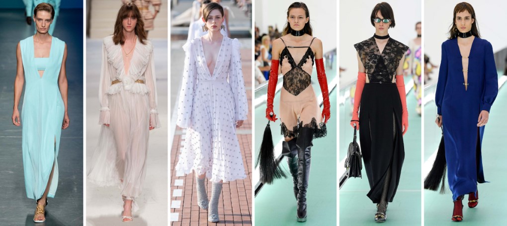 深V領口凸顯上半身的線條,伴隨下半身飄逸的長裙成功詮釋性感卻不失優雅,雖是相同元素但不同的品牌設計所演繹的風格也不同,並可參考浪漫閨房細節,作為春夏季的晚裝新趨勢。