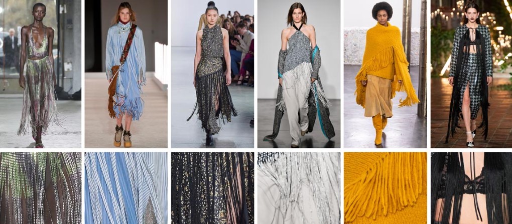 長條流蘇以不同的材質和粗細呈現出多種的樣貌,將民族工藝趨勢運用在20/21秋冬紐約女裝中。Area以炫彩帶有科技光澤感的立體珠片,組合成背心上衣及流蘇裙襬,結合手工藝設計與未來科技主義,營造出前衛造型。Palm Angels將兩件長版襯衫層疊穿搭,利用直條紋圖樣和寬條流蘇布條,融合民族風與現代裝扮,展現造新樣貌。Jeffrey Dodd延續挖肩針織背心下擺,以不收邊的方式讓毛線露出成為長流蘇,再搭配上蓋褲腳寬褲及寬大的外套,整體充滿隨興休閒感。Gabriella Hearst全身黃色調裝扮,運用上衣下擺延伸出粗毛線條流蘇與下身裙擺呼應,呈現流動線條。Rodarte表面呈現膠感光澤的復古千鳥格紋套裝,以綁帶開襟外套剪接長長的細繩黑流蘇,錯落之間隱約透出蕾絲內衣與開岔裙擺腿部線條,展現隱約之美。