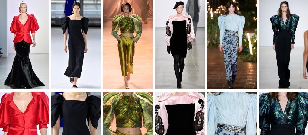 靈感源自立體雕塑、室內設計等,藉由概念剪裁打造優雅女性化輪廓,運用弧線打造量感肩部和擴版袖型,藉此升級襯衫、西裝等單品。Badgley Mischka的紅色緞面西裝,利用泡泡袖型的誇張肩袖加上收腰線條,再搭配黑色大魚尾裙襬,以強烈的曲線結構展現女性化廓型。 Carolina Herrera從前胸肩接位置延伸出類似蝴蝶結的份量感袖型,為簡約裝扮增添復古的甜美感。Cristopher John Rogers帶有二向色的光澤面料,以硬挺的質感打造弧形輪廓袖型,與下身線條形成對比,帶出具未來感的復古裝扮。Libertine的拼接洋裝,利用色彩的差異將視覺聚焦在肩部,再以側邊皺褶抓和誇張墊肩、立體蝴蝶結、小提琴亮片繡片,增添肩袖的戲劇性。Rodarte和Tadashi Shoji皆以上寬下窄的羊腿袖型表現份量感肩部,再將襯衫內紮褲頭,勾勒出變化的曲線。