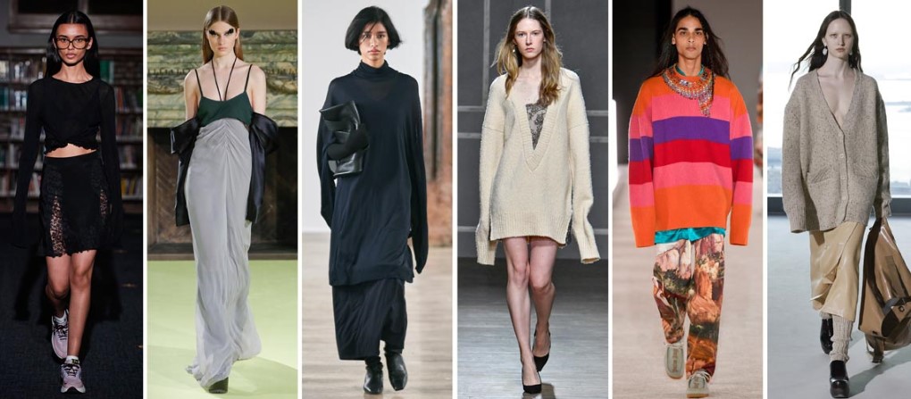 蓋過雙手延伸至新長度的超長袖長,以新比例打造全新美感,適合用以詮釋未來感主題。Vera Wang長拖襬洋裝搭配上,從露臂寬口到貼合手臂線條的露肩設計,使整體視覺更加修長。The Row簡約休閒的全黑套裝,以長版上衣和超長袖,搭配露出較短的下身比例,增添了款式慵懶隨興的氣息。Hellessy寬版落肩米白色大V領毛衣拼接透膚蕾絲,袖長比例超過上衣長度,打造出新的長版上衣單穿樣貌。Palm Angels和Sies Marjan寬大的毛衣加上超長袖呈現出弧形的繭型輪廓,再與較合身的下身搭配,凸顯出被包覆的視覺效果。