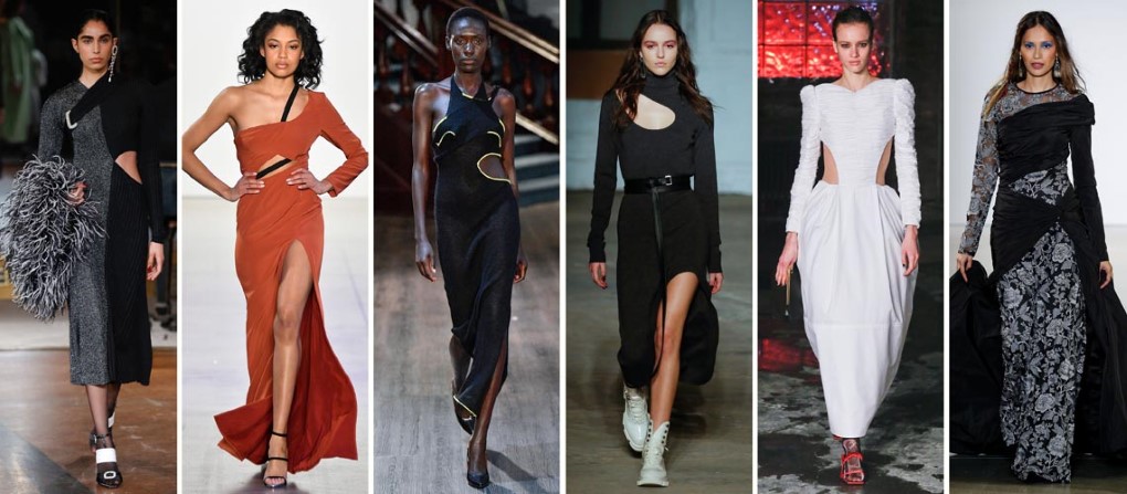 20/21秋冬將時常用於運動風的局部鏤空設計,更廣泛的運用到其他款式。以剪接、纏繞打造的局部鏤空設計,以挖空結構探索空白之美。Prabal Gurung結合今年流行的亮片材質與針織布料,並於單邊鏤空設計,為派對裝扮增添新亮點。Aliette以黑色線條穿插於挖空結構中,呈現出新的鏤空細節成為焦點。Eckhaus Latta全黑貼身針織禮服,以螢光綠跳色滾邊裝飾鏤空設計,營造出運動前衛的禮服造型。Monse的高領貼身洋裝,從肩部到胸前以弧形挖出鏤空結構,並與斜對角的不規則下擺呼應,展現出女性之美。外型輪廓具雕刻感的Khaite全白洋裝,腰間兩側以鏤空線條打造出新的修身視覺效果。Tadashi Shoji禮服表層的局部鏤空纏繞與內層蕾絲服裝層次搭配,打造出冬季的前衛時尚穿搭。