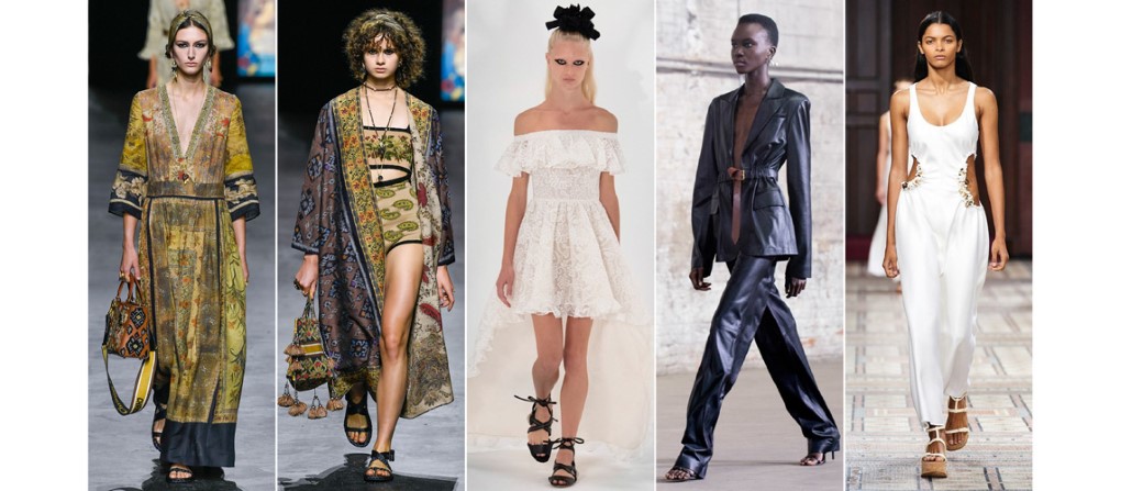 西裝+短褲的套裝搭配仍是焦點,也有很多針織與編鉤織洋裝。此外也有一種感官肉慾的風潮滾滾而來,這類的皮革款式表現非常多樣,還有透明的層次穿著,大量的中空選擇,從軛領露背上衣到胸衣式上衣。