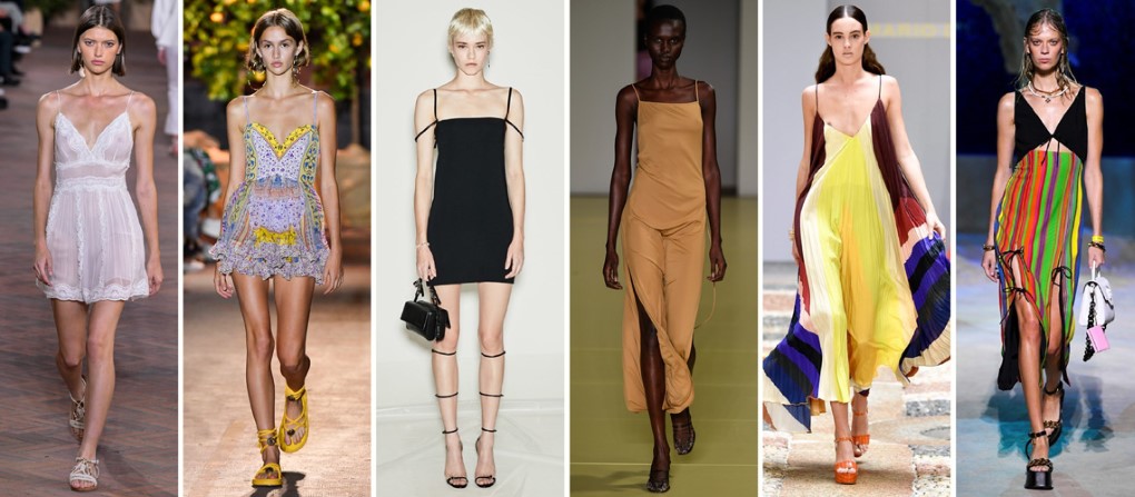 平口細帶的領型稍微平衡了性感的風貌,例如Dsquard以較挺的材質剪裁出合身線條顯得俐落有型,Salvatore Ferragamo則用軟質面料搭配過膝款的優雅削弱性感氣息。