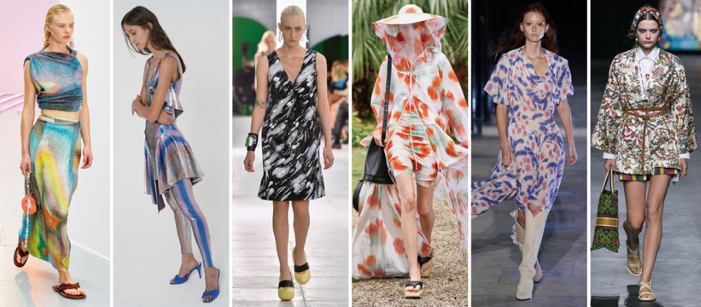 Balenciaga使用單色的柔和模糊暈染,搭配上面料的細摺,彷彿花朵浸泡在水中。Dior以紮染方式呈現線條圖案,鮮明對比的撞色手法呈現時尚民族風。