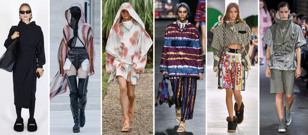 Louis Vuitton在短版帽T中加入不規則的皺褶設計,超長的抽繩綁帶垂墜在外,搭配同類型的黑白條紋墊肩開襟截短襯衫,以及帶有壓摺效果的繽紛印花五分寬褲,成為精緻街裝的新選擇。