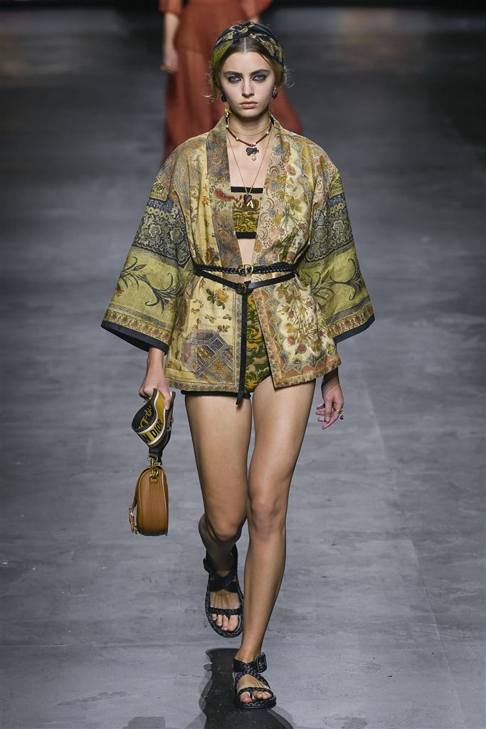 Dior將帶有民族圖騰運用在內層的胸衣套裝和外罩寬大長袍,以皮腰帶勾勒腰部曲線,充滿優雅的度假氣息。