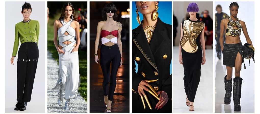 2022春夏巴黎設計師為服裝增添了精緻華麗的金屬輔料裝飾,強烈質感和金屬光澤的裝飾細節更能凸顯服裝個性,超大尺寸的金屬飾品讓服裝多了堅韌而奢華的視覺。