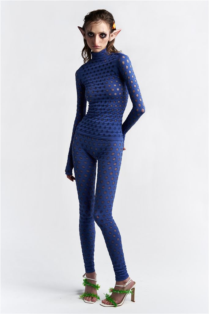 智能藍色蕾絲取代常見的黑白色系成為新的性感色彩,Dion Lee以飽和亮藍色和解構式剪裁替性感添加個性感,搭配硬挺街頭風格工裝褲,跳脫柔美和妖嬈,表現出現代女性不想被框架定義的一面。