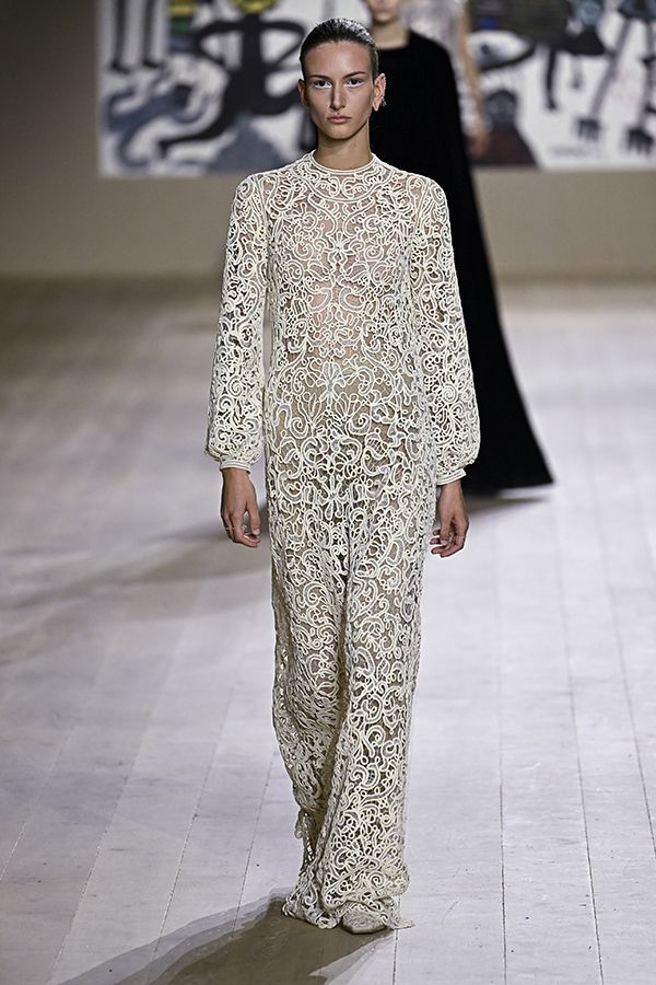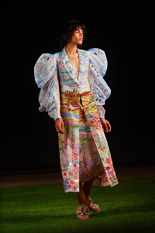 而在款式上,充滿現代感的連體衣、古典的束腰結構、廓形感的大袖子與男裝元素都是設計上的重點元素。