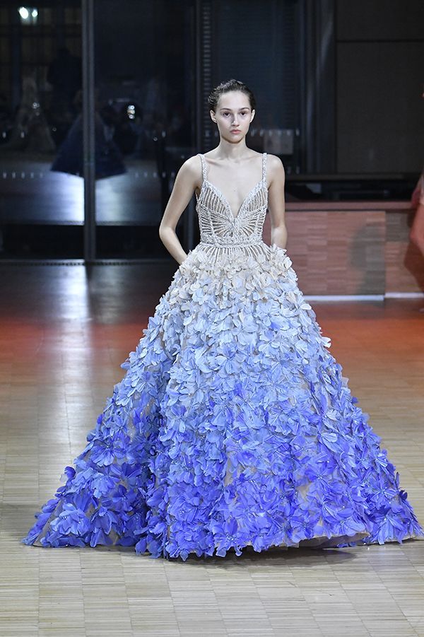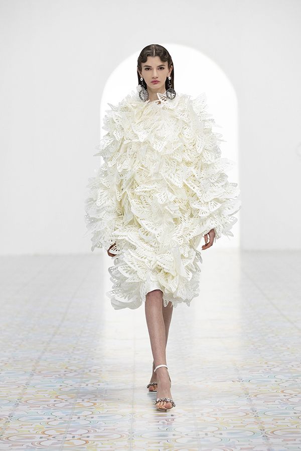 因此在2022春夏我們可以看到,一貫強調“經典”路線的高訂,明顯受到了時裝潮流的影響:色彩方面,各種粉嫩的亮色系如粉紅色、鵝黃色等大行其道;材質方面,緞面與薄紗、輕盈的羽毛、華麗的釘珠與亮片、充滿仙氣的裝飾花朵等依然是主流。