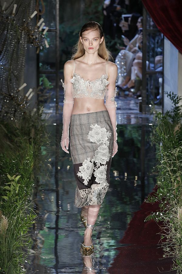 以復古格紋當作基底,Shuting Qiu置上亮片手工縫製蝴蝶、花朵,顛覆呈現活潑前衛的拼接樣貌。Antonio Marras則是用大朵的蕾絲玫瑰花,表現鮮明的花朵與格紋之間的衝突美感。