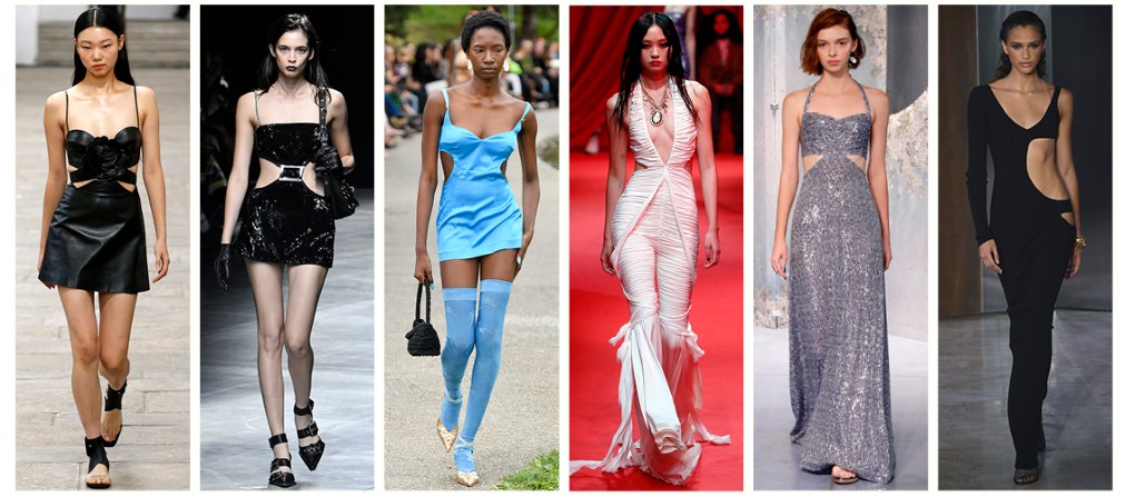 以細肩帶短洋裝搭配腰間挖空設計,絕對性感無疑,如Ermanno Scervino的罩杯式交叉帶,和Annakiki、Marco Rambaldi的漏斗型剪裁,三者皆在兩側均勻的、自信的露出腰間,營造Y2K的青春活潑感。