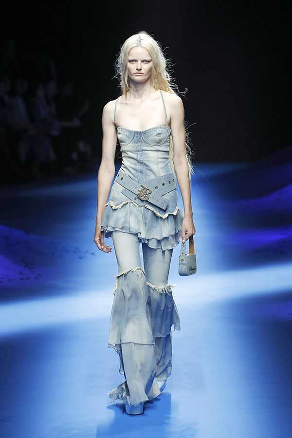 同樣在寬版腰帶上打上整排雞眼洞,Diesel從上身纏繞到裙頭的設計,和Blumarine單純的V形腰帶,都成功混搭搖滾風格和Y2K風格,展現出毫不矯揉造作、非常俐落有型的新女性。