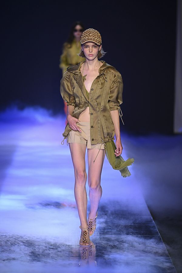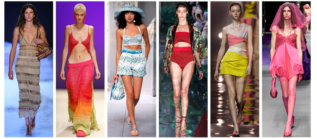 潔白柔細的沙灘、微醺的雞尾酒、透徹清涼的海水,碰撞出夏日度假海濱的歡樂氣氛,2023春夏米蘭時裝週環繞著為夏日派對而裝扮的性感風格,通透的鏤空編織、胸衣式短褲套裝、高明度高彩度的細帶洋裝與泳衣,樂觀的多巴胺色組,歌詠夏日的歡愉。至於材質的變化則相當多元,不論是硬挺透氣還是柔軟貼身,露出肌膚後的魅力不可言喻。