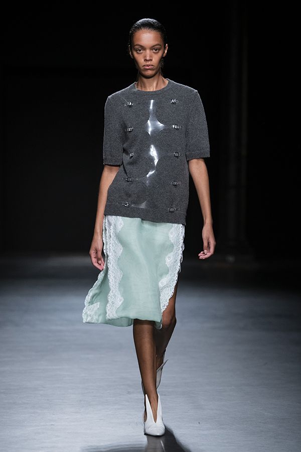 David Koma將透明薄紗作為裁片拼接在大身,巧妙地製造了仿佛鏤空的視錯覺效果。