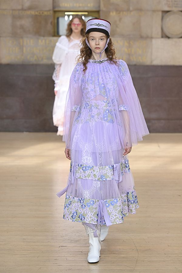 Molly Goddard慵懶的上半身與繁複華麗的下半身裙裝結合的非常有趣,紫色流行色的應用也更讓這個款式多了一種青春鬼馬的氣息。