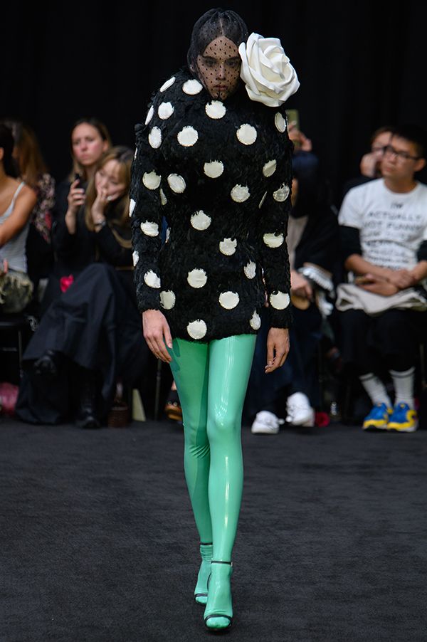 Richard Quinn設計師用膠感的果綠色長襪搭配波點球形上裝,看似不合理的搭配卻意外地散發出了一絲文藝氣息。