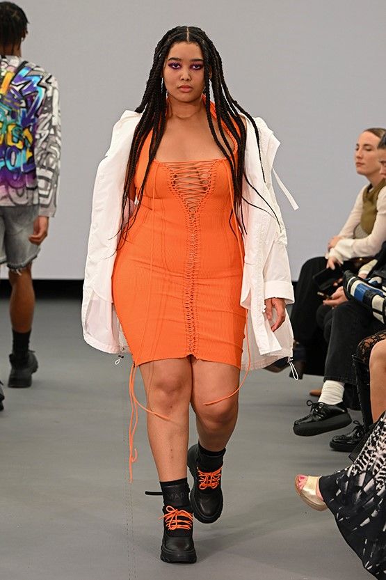 充滿療癒的力量。 Mark Fast亮橘色的裹身針織裙,胸前採用了繫帶細節,加上高飽和的色彩,吸睛度滿點。