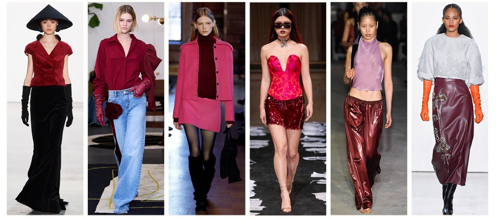 Pantone 2023的年度代表色Viva Magenta也出現在2023/24秋冬紐約時裝週,略帶著酒紅與紫色調的 Viva Magenta象徵著力量感、自由與包容性,在多重危機且充滿不確定的的現在,這個飽和大膽的紅色為紐約帶來了一股振奮人心的力量。布料應用上可以選擇凸顯光澤或紋理的材料,例如皮革、亮片、絲絨、絲光棉或緞面、烏根紗,讓服裝的精緻感更加提升;至於如何展現這個個性強烈又明亮的色彩,我們可以借鏡紐約時裝周上設計師搭配用色手法。