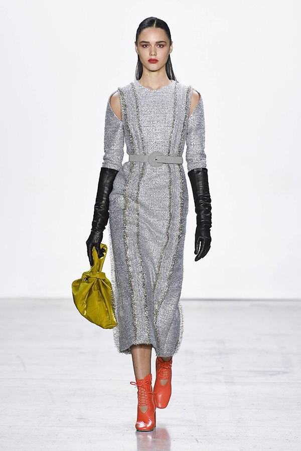經典實穿的無彩灰色是跨場域服裝的最好選擇,Bibhu Mohapatra在都會經典的毛呢布料中加入大量銀色蔥紗,提升華麗感的面料製作成古典優雅小洋裝,無論是通勤或是派對都十分合適。