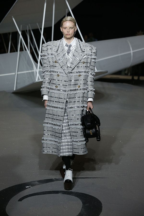 在實用性與創意度的平衡上,Thom Browne有著絕佳表現,五種不同的織花毛呢面料和緹花襯衫布層層組搭,以深淺變化的無彩灰色統一整體視覺,展現細膩的設計搭配,並在日常中加入搞怪趣味。