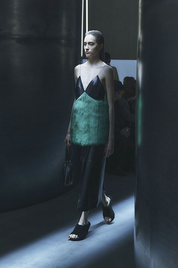 Helmut Lang利用寶石綠搭配細緻幻彩亮片來更新基礎的工作服視覺,人工感強烈的綠色加上科技氛圍的數位光感,形塑出具未來感的現代服裝。