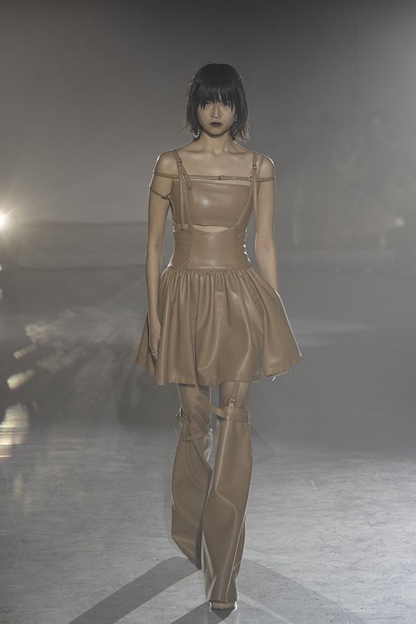 首次在紐約時裝週走秀的西班牙設計師品牌Luis de Javier,在作舊的純素皮革上加上銳利張狂的裝飾尖刺,以強悍且叛逆材質呈現未來主義的戰士外觀。