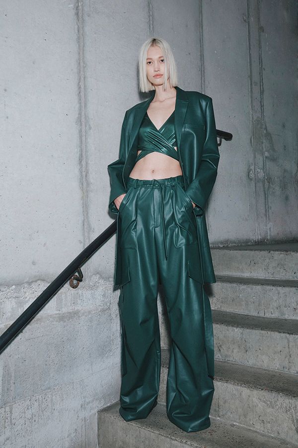 柔軟質感皮革搭配深邃濃郁礦石藍,Altuzarra利用材質和顏色搭配替正裝帶來神祕氛圍,礦石藍為皮革材料帶來新鮮感,深色調與套裝設定兼具實用性。