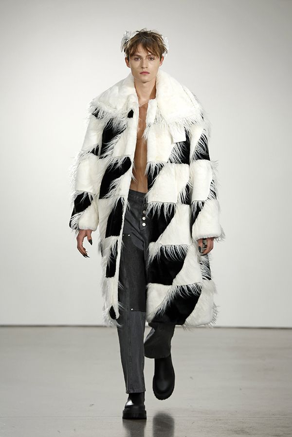 Private Policy將豐厚皮草以黑白拼接呈現棋盤格圖樣,搭配加長的毛絨飾邊強化視覺效果,實驗性強烈的立體材質替服裝帶入自由不羈的街頭風格。