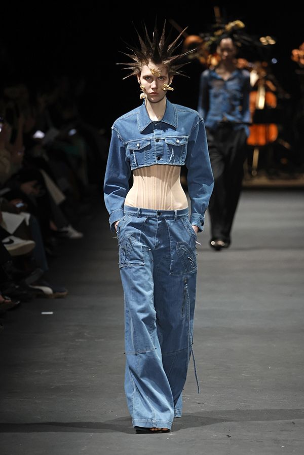 延續上一季的丹寧熱潮,2023/24秋冬持續是青少年及休閒打扮的重要元素,牛仔布特有的隨性感搭配闊腿褲是入門款,尤其低腰線條應用在筆直的長裙或是長褲非常有千禧感,如Cormio的粉紅色丹寧長裙搭配小可愛顯得青春洋溢。但另方面,緊身或直筒的褲款也逐漸回歸,受到時尚先鋒們的喜愛。