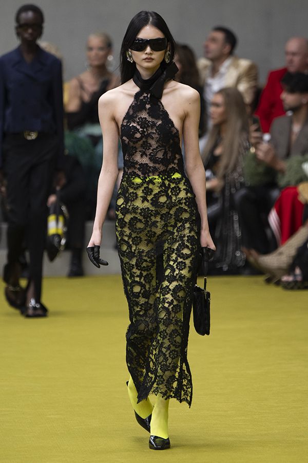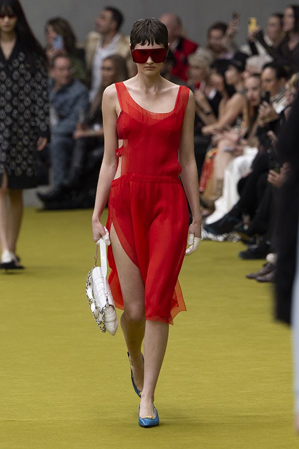 輕薄半透的薄紗,過去多以梭織或網眼面料為主軸,但本季細緻的針織提供了一個更新的選擇,運用在貼身的造型中,像是Blumarine、Fendi輕薄舒適的針織連身洋裝,略帶透視感的效果及貼合曲線的輪廓,顯得優雅又性感,另外像是MSGM僅擋住胸部的透明針織上衣,也是大膽又簡約。