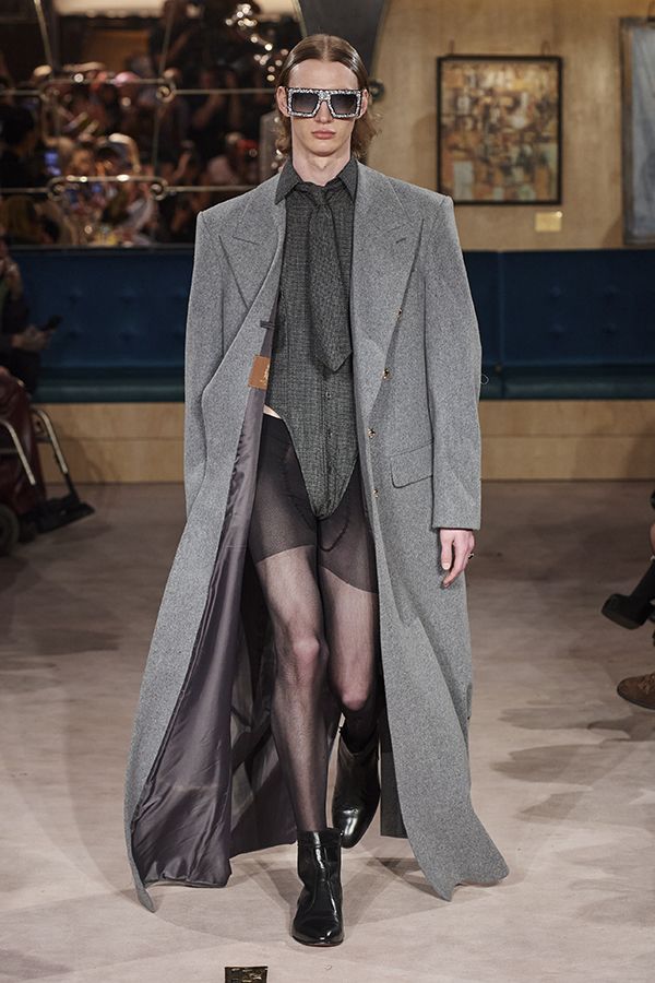 Edward Crutchley的正裝透過加寬的肩型與疊穿背心的方式,呈現出上寬下窄的份量感輪廓;拼接同色調布料的設計細節,則讓視覺更顯豐富。