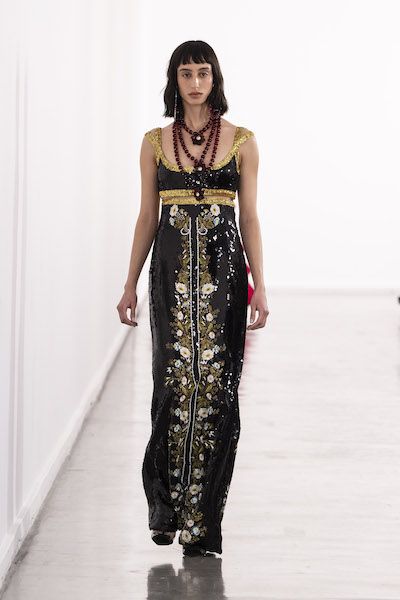 Dries Van Noten的雪紡長裙與蕾絲翻褶腰帶,經由繡金色管珠如同描金般的細線,適時點綴的閃耀金色,鋪陳在衣身上展現輕微的神聖奢華。