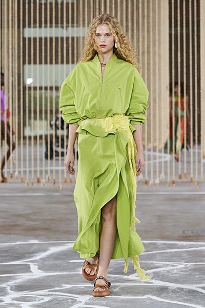 剪裁、亞麻和鉤針編織中大量毛邊下擺也有一種「未完成」的感覺。設計師繼續從海洋中汲取靈感,貝殼和航海筆記以及從頭到腳的牛仔布回歸。配件方面,腰帶、中跟鞋、芭蕾平底鞋和金屬色持續出現。