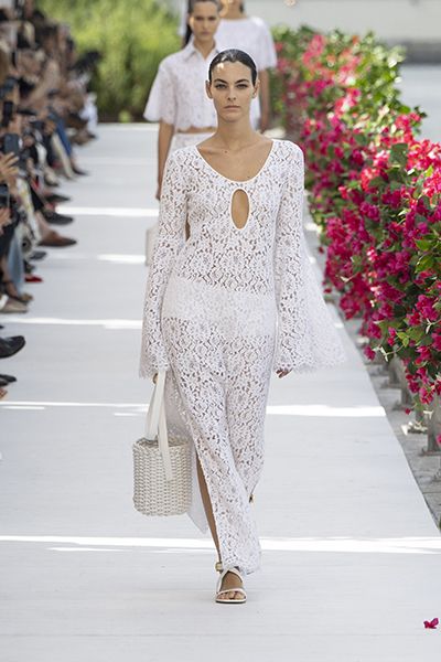 Michael Kors帶有度假氛圍的款式,以全白花卉蕾絲勾勒傘狀的袖口、前胸鏤空和裙側開衩等設計,更顯女性優雅魅力。