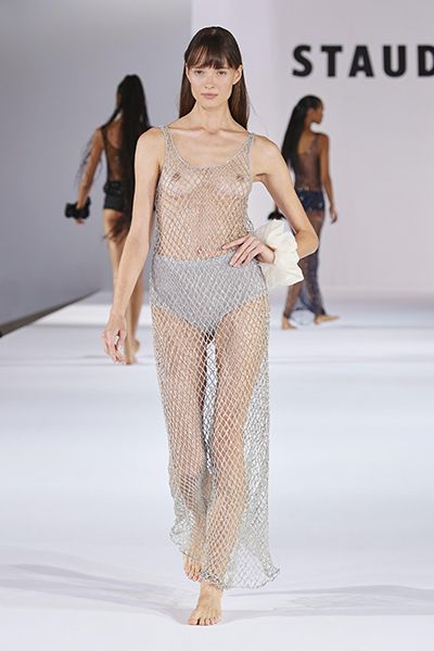 Staud穿著一件拖地的銀色漁網連身裙,只搭配一條三角褲,前衛的造型抓住眾人目光。