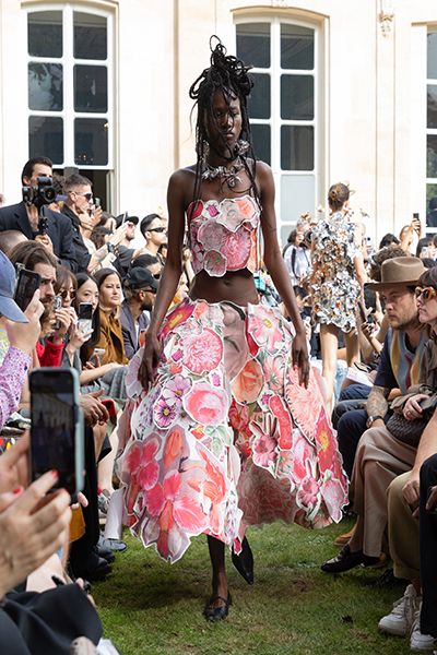 同樣以花朵作為靈感來源,設計師Gabriela Hearst在Chloé的2024春夏系列中,以豐富的設計手法與輪廓刻畫花朵從含苞到盛放的多元樣貌,在鈎針鏤空洋裝上縫上以皮料製成立體花朵,以精緻皮革工藝展現清新俏皮風格。
