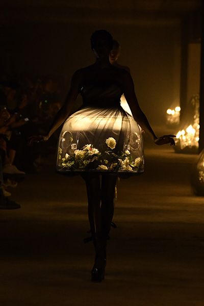 Alexander McQueen將寬肩設計、緊身馬甲與花苞裙擺相結合,以立體輪廓重塑現代洋裝,輪廓明顯的洋裝打造現代盔甲般的外觀,前胸長形鏤空添加女性氛圍,體現女性的堅毅與自信。